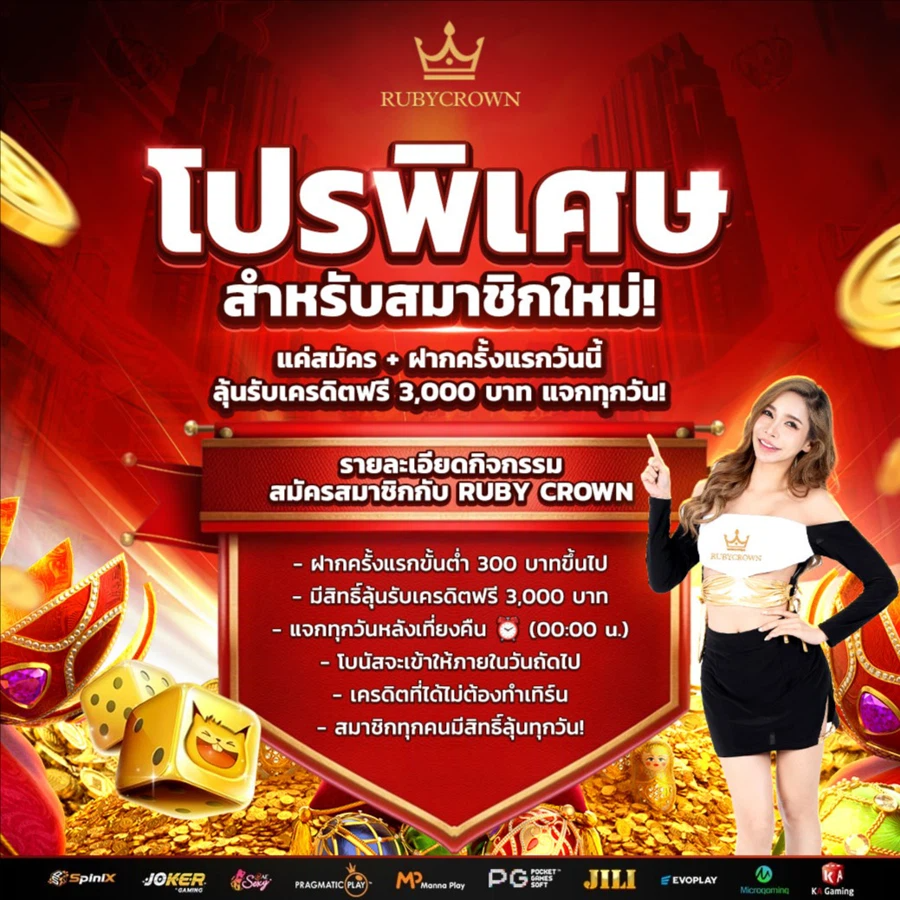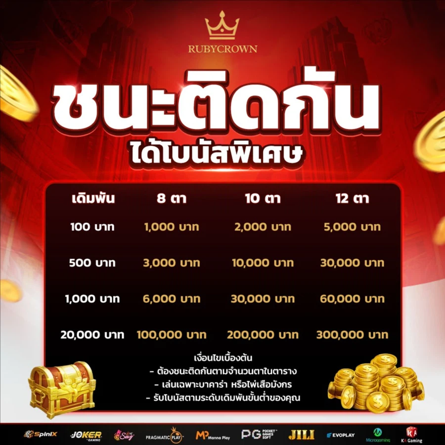 * โบนัสและโปรโมชั่น: RubyCrown เสนอโบนัสและโปรโมชั่นต่างๆ เพื่อดึงดูดผู้เล่นใหม่และรักษาผู้เล่นเดิม