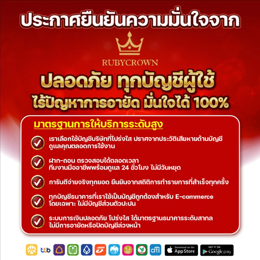 ที่สำคัญคือ RubyCrown ให้ความสำคัญกับเรื่องความปลอดภัยและความน่าเชื่อถือเป็นอย่างมาก พวกเขาใช้ระบบรักษาความปลอดภัยที่ทันสมัย เพื่อปกป้องข้อมูลส่วนตัวและเงินทุนของสมาชิกทุกคน นอกจากนี้ยังมีการตรวจสอบและควบคุมอย่างเข้มงวด เพื่อให้มั่นใจว่าทุกเกมเป็นไปอย่างยุติธรรมและโปร่งใส